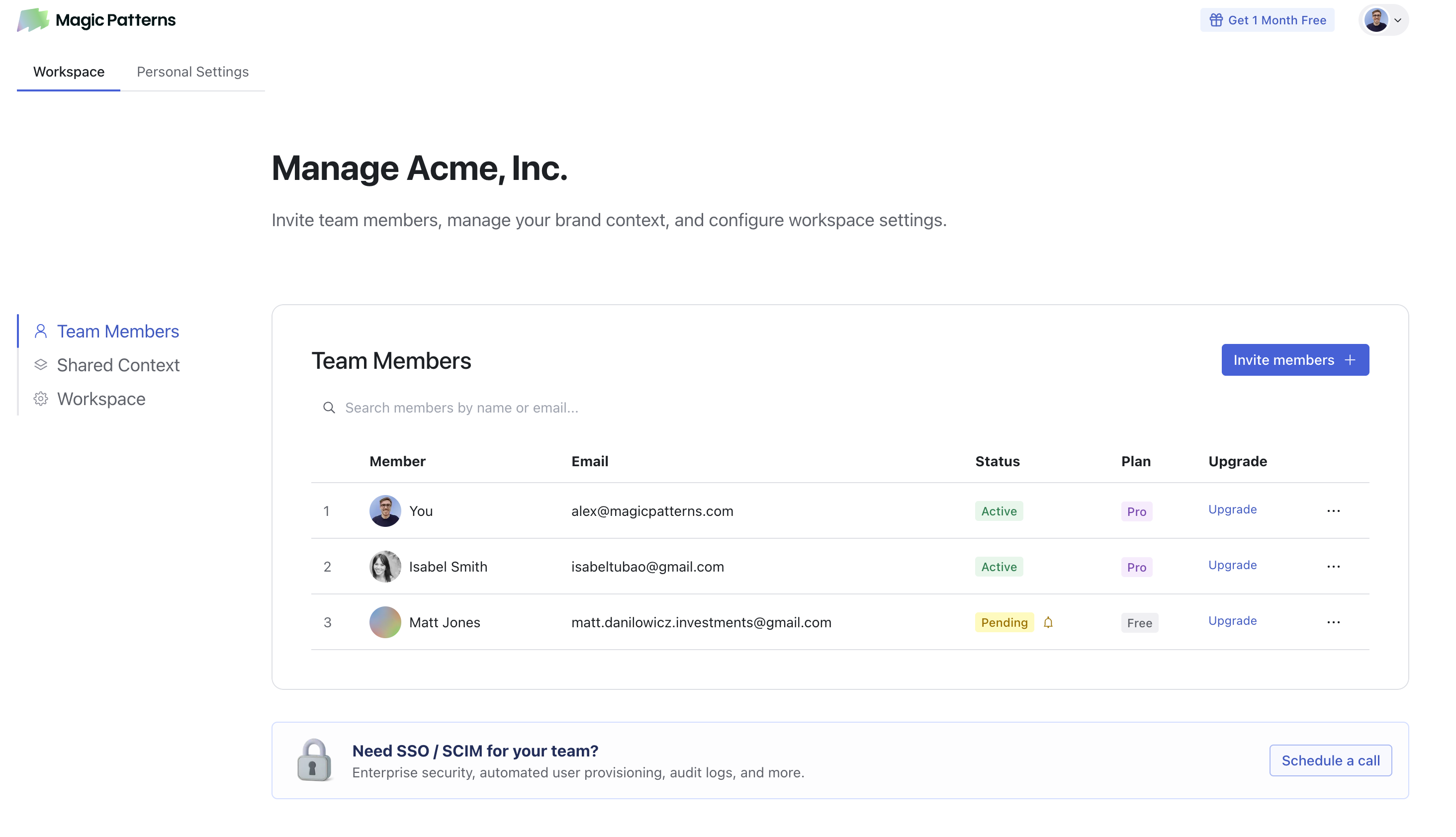 We support SSO and SCIM for team workspaces. Read more about SSO and SCIM setup.Managing Members