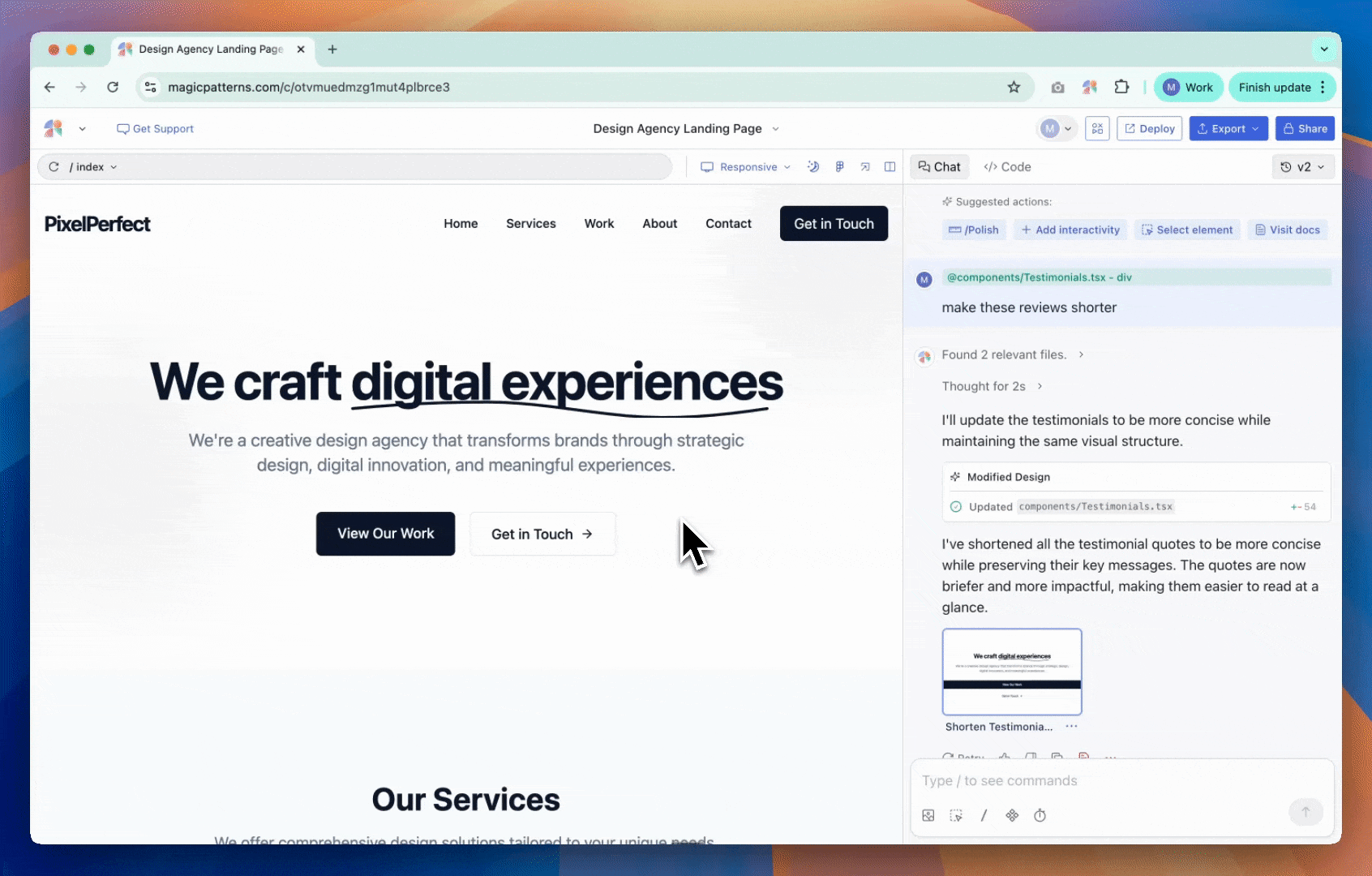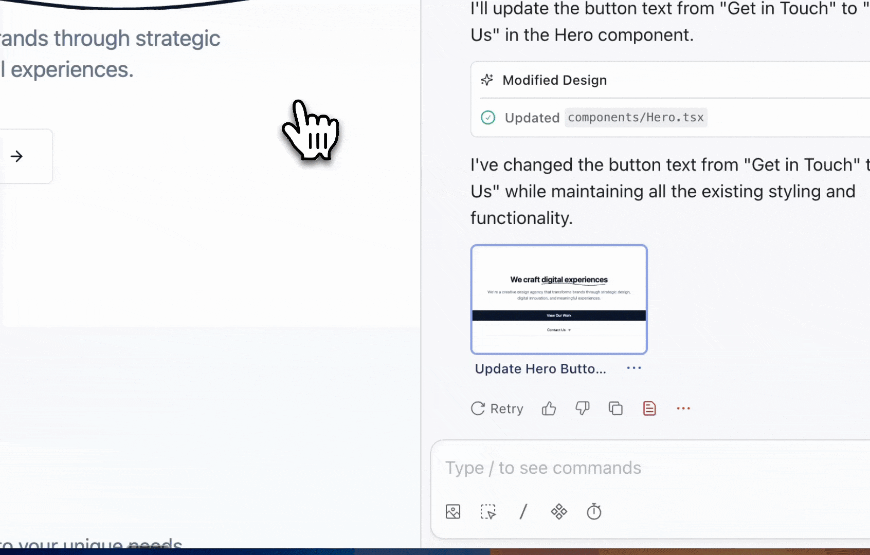 Select Mode lets you click on specific elements in your design to tell the AI exactly what you want to change. This eliminates confusion and makes your prompts much more precise.
