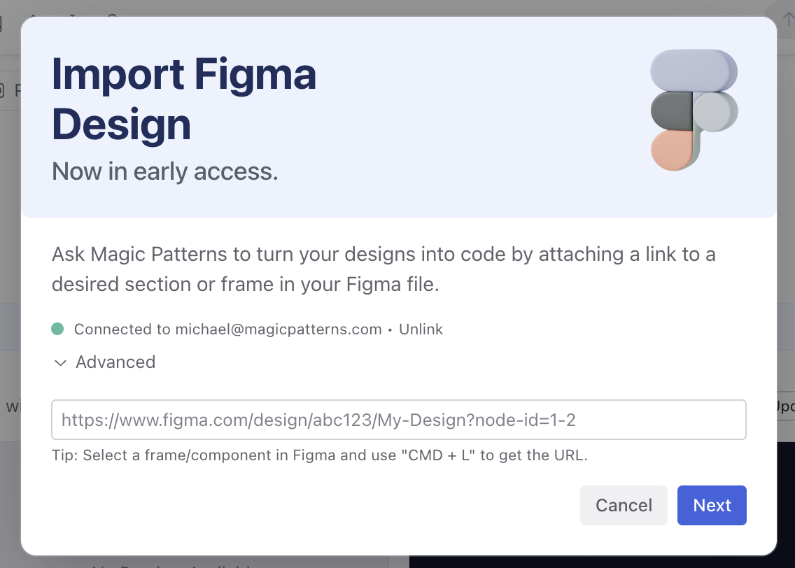 Paste the link into the Magic Patterns import dialog and click 'Next'