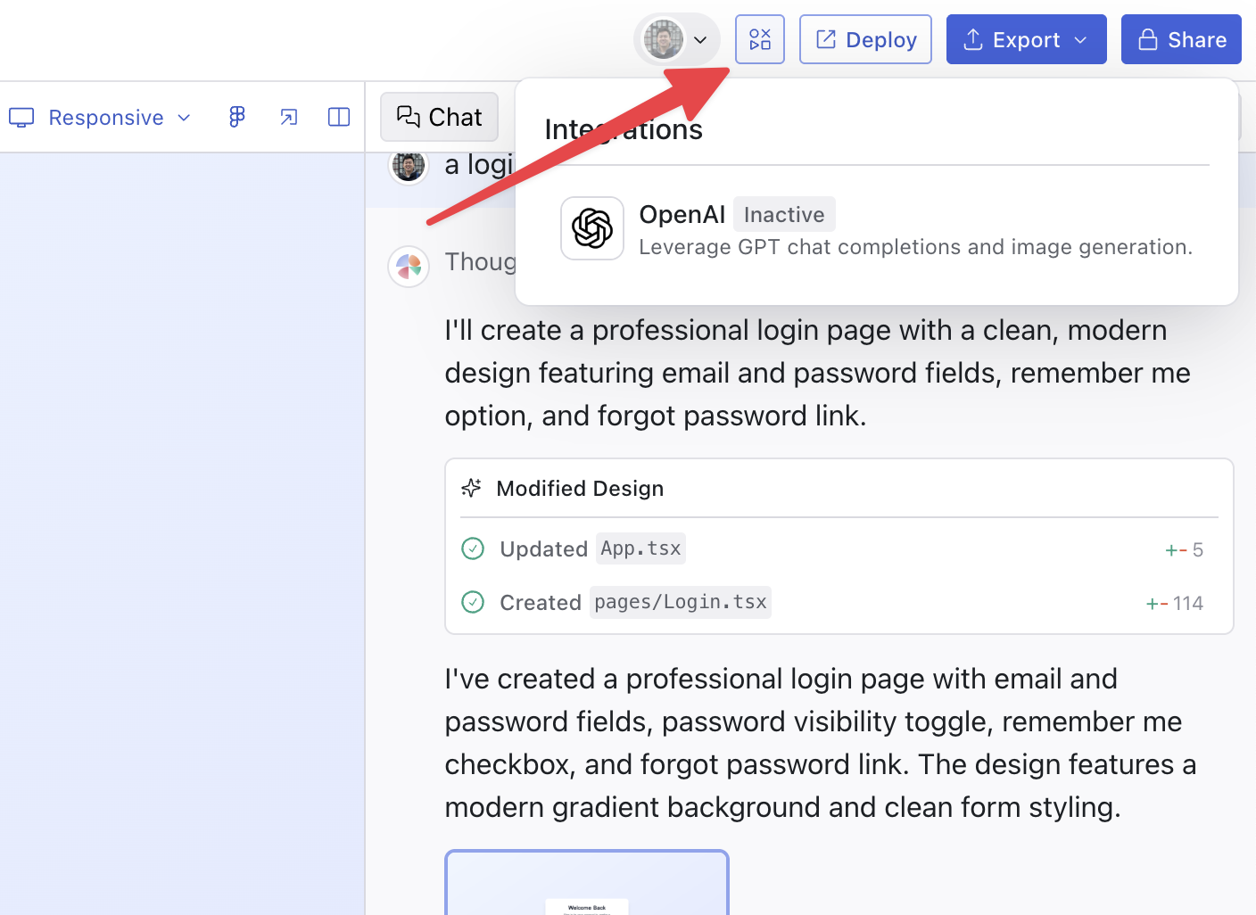By default, Magic Patterns will not connect to OpenAI. Once the integration is enabled, you can